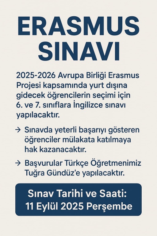 2025 2026 Eğitim Öğretim yılı Erasmus Projesi kapsamında yurt dışına gidecek öğrencilerin seçimi için 6. ve 7. sınıf öğrencilerine ingilizce sınav yapılacaktır.